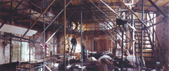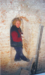 Als nieuweling in dit vak was ik nieuwsgierig. Lezen over de Middeleeuwen of het bezoek aan een museum is iets heel anders dan zelf met je handen als het ware de tijdlagen van de muren aftikken en krabben. Met een steenhamertje en een chirurgenmesje zijn Helmer Hut en ik begonnen in de hoogste punt van het koor met de druiper van Bremer zandsteen. Via houten platen op de balken konden we net bij dat hoogste punt komen. Zo zijn we al klimmend en klauterend de hele kerk door getrokken. Franke, mijn Fryske wetterhûn, ging mee naar boven en had hier in de kerk de tijd van zijn leven. Al de verwennerijen van Doede Wijngaarden en Sietse de Jong van Restauratie Bouwbedrijf "Bouw '75" deden de hond 's ochtends met plezier mee naar het werk gaan. Hij is in de loop van de tijd bevorderd tot opzichter en kerkbewaarder en hield voornamelijk het kerkhof vrij van katten. |