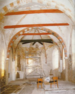 en hij heeft hele smalle schouders. Na het verwijderen van de bovenste kalklagen kwamen we aan de volgende fase van het blootleggen. Opnieuw zijn we begonnen in het koor van de kerk, met het verwijderen van de laatste resten kalk, tras, beton en gips en wat dies meer zij, centimeter voor centimeter. De allerlaatste laag direct op de schildering moest heel voorzichtig met een chirurgen mesje en een klein steen hamertje. Daarna volgde het dichtmaken van scheuren en gaten in en rondom de schilderingen, dus metselen en stukadoren tot op de vierkante centimeter. Aan het geluid met je hamer of mesje kon je horen of de laag al dan niet goed vast zat op de ondergrond en of er eerst andere maatregelen getroffen moesten worden voordat je verder kon gaan. Vooral bij heel slechte gedeelten was het vaak noodzaak om eerst de schildering vast te lijmen op de onderlaag, de muur. Als er geen geschikte scheurtjes of gaatjes in de schilderlaag zaten was het nodig om er eerst kleine gaatjes in te boren en met een injectienaald lijmvloeistof achter de schildering te spuiten, zodat de laag zich zou hechten aan de muur. Deze gaatjes werden daarna weer dichtgemaakt met eer kalkmengsel zodat er geen storende gaatjes in de schildering zichtbaar bleven. |